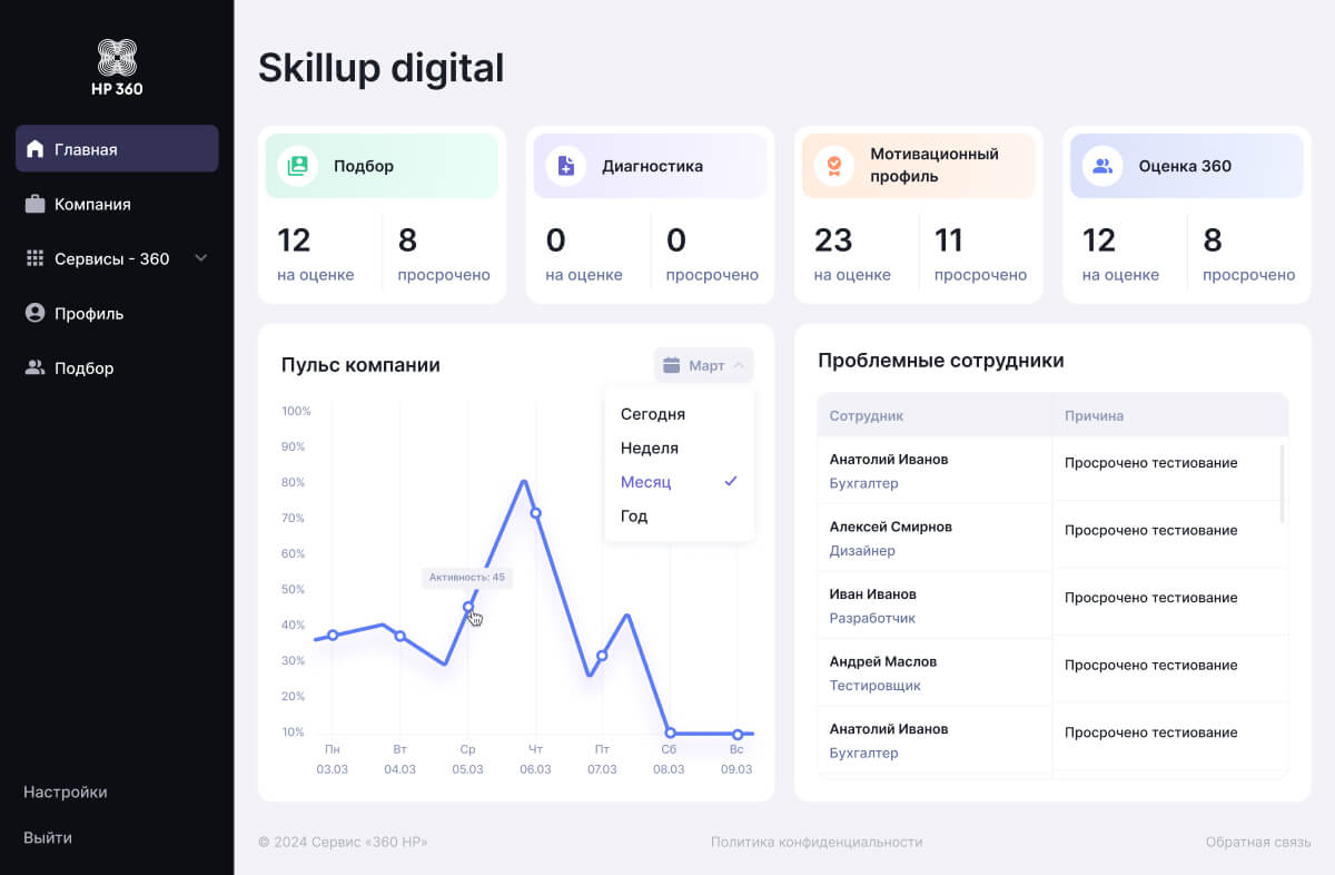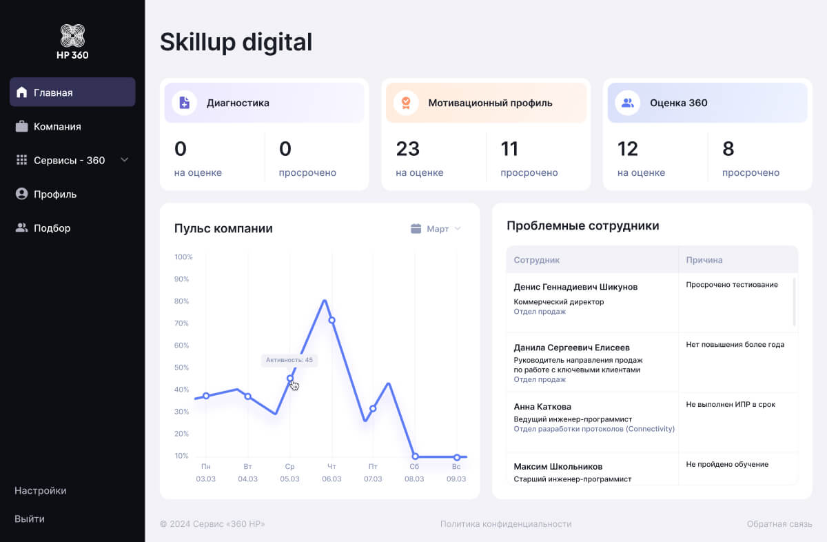 Главная: сводные метрики, динамика активности и список сотрудников с проблемными зонами.
